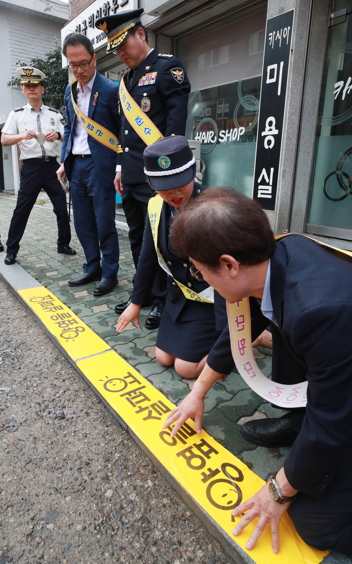 더불어민주당 박주민 의원, 이용표 서울지방경찰청장, 천경숙 전국녹색어머니 중앙회장, 조희연 서울시교육감(왼쪽부터)이 서울 은평구 역촌초등학교 앞에서 열린 '2019년 가을 신학기 교통안전 캠페인'에서 등굣길 교통안전을 위한 노란 발자국 스티커를 부착하고 있다.