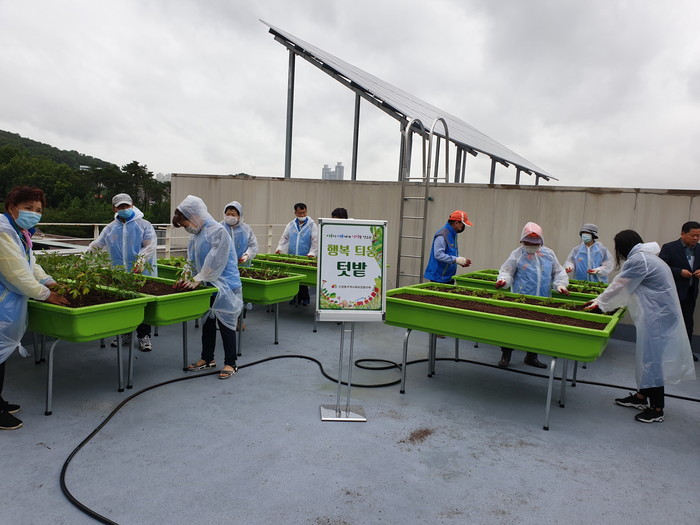 경기 오산시 신장동지역사회보장협의체는 30일 신장동행정복지센터 옥상에서 동 특화사업 ‘행복틔움 텃밭가꾸기 사업’으로 모종심기 행사를 열었다. 텃밭가꾸기 사업은 청사 옥상에 텃밭을 가꿔 지역내 취약계층에게 제공할 쌈채소 등 부식재료를 재배하는 것이다. 사진은 참여자들이 모종을 심고 있는 모습. (사진제공=오산시청)