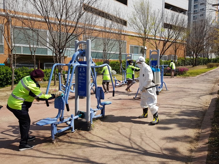 경기 남양주시 새마을교통봉사대가 최근 코로나19 확산 방지를 위해 지역내 화도읍, 퇴계원읍, 수동면, 호평동, 평내동, 금곡동, 양정동, 다산1동, 다산2동 일대 택시승강장 및 버스정류장을 대상으로 방역작업을 펼쳤다. 사진은 봉사대원들이 소독을 하는 모습. (사진제공=남양주시청)