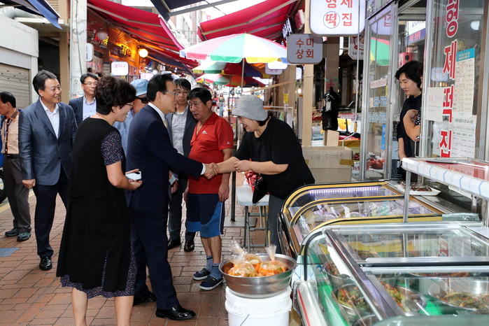 2일 서울 강남구 영동전통시장에서 ‘갈갈이 박준형, 영동시장에 뜨다!’ 미니 노래자랑이 개최됐다. 이날 노래자랑에서는 12팀이 무대에 올랐고, 최우수·우수상 수상자는 10월 강남페스티벌 ‘싱어킹’ 참가자격이 주어졌다. 사진은 노래자랑에 참석한 정순균 구청장이 시장 상인들과 인사를 나누고 있는 모습. (사진제공=강남구청)