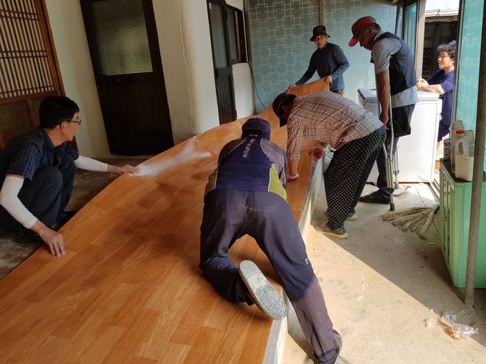충남 홍성군 귀농귀촌인연합회가 추석명절을 앞두고 최근 은하면의 한 취약계층 가정을 방문해 재능기부 봉사활동을 펼쳤다. 사진은 연합회원들이 장판을 시공하고 있는 모습. (사진제공=홍성군청)