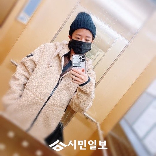 사진 속 신지는 양털 점퍼를 입고 비니에 마스크를 쓰고 고개를 살짝 기울이고 있는 모습이 인상적이다.
