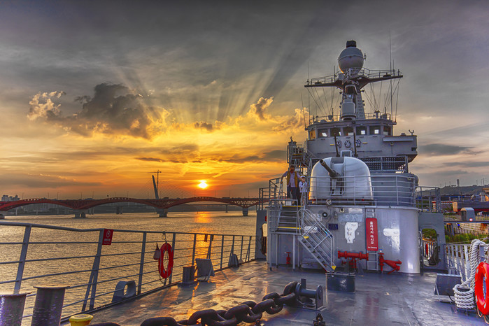 | ▲ 서울함에서 바라본 일몰. 일몰 구경을 마친 관람객들이 서울함에서 내려오고 있다. (사진제공=서울시청) |