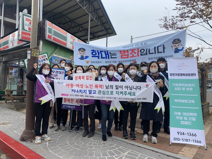 이번 캠페인은 합천군청, 합천경찰서, 합천가정행복상담센터, 합천드림스타트 및 경남서부아동보호전문기관 등 유관기관 합동으로 추진했으며, 삼가 장날을 활용하여 삼가시장 일대를 중심으로 진행했다.