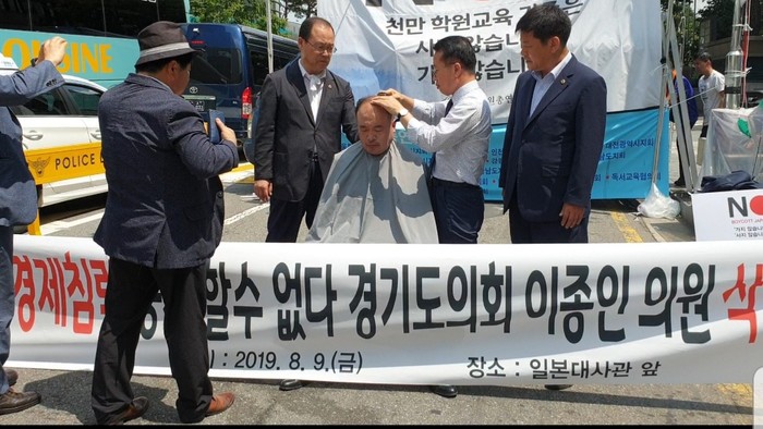 [수원=채종수 기자] 경기도의회 기획재정위원회 이종인 의원(더불어민주당·양평2)이 일본 대사관 앞에서 삭발식을 거행했다.