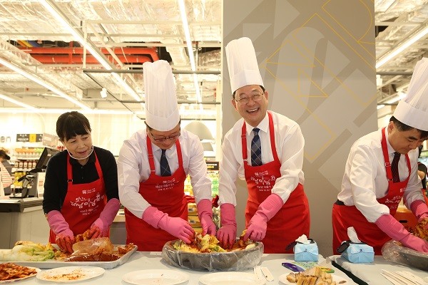 | 명현관 해남군수(우측부터 두 번째)가 지난 18일 경기도 부천 SF점에서 해남배추 소비촉진을 위해 이마트에브리데이 판촉행사에서 홍호임 이마트에브리데이 상무 및 행사관계자들과 김장김치를 담그며 환하게 웃고 있다.=사진. 해남군 제공 |