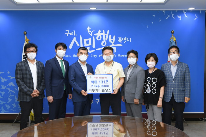 경기 구리시는 지난 7월31일 (주)투게더홀딩스로부터 지역내 취약계층을 위한 백미 10kg 120포, 20kg 11포 등의 후원품을 전달받았다. 사진은 전달식에는 안승남 시장(가운데)과 (주)투게더홀딩스 관계자들이 기념촬영을 하는 모습. (사진제공=구리시청)