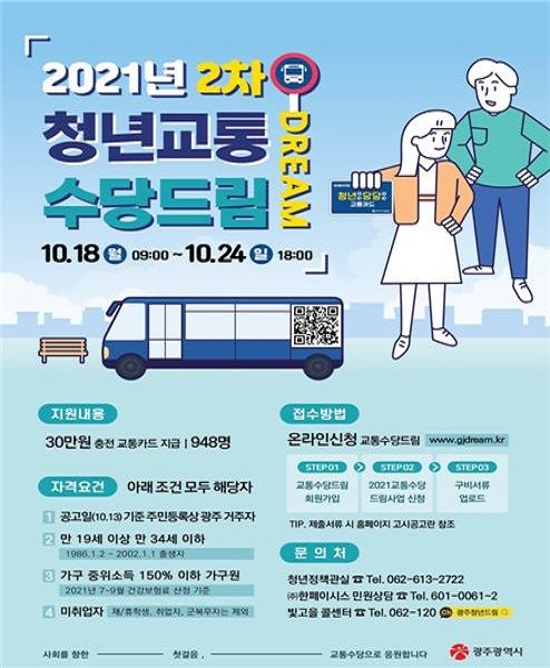 참여 신청은 18일부터 24일까지 청년교통수당 드림 홈페이지에서 하면 된다. 대상자 선정결과는 11월5일 광주시 홈페이지에서 확인할 수 있다.