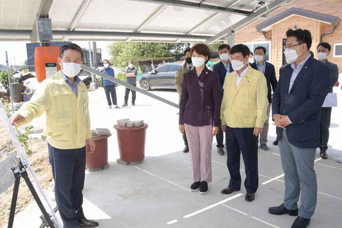 한정애 환경부장관이 최근 경기 동두천시 하수처리장을 방문했다. 이날 동두천시 환경사업소는 한 장관에게 한탄강 수질개선을 위한 색도 저감과 관련한 현황 및 애로사항을 보고했다. 사진은 한 장관(가운데), 최용덕 시장(오른쪽 두 번째)이 관계자에게 보고를 받고 있는 모습. (사진제공=동두천시청)