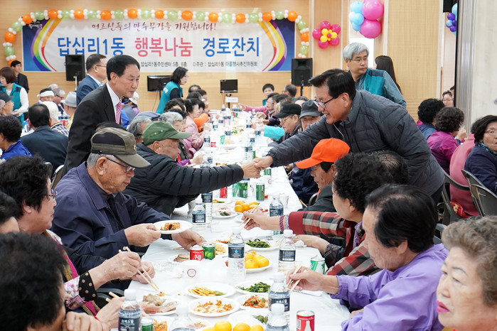 서울 동대문구가 29일 답십리1동과 2동, 전농2동에서 지역내 노인을 대상으로 한 ‘경로잔치’를 개최했다. 사진은 ‘답십리2동 경로잔치’에서 유덕열 구청장이 노인들과 반갑게 인사를 나누고 있는 모습. (사진제공=동대문구청)