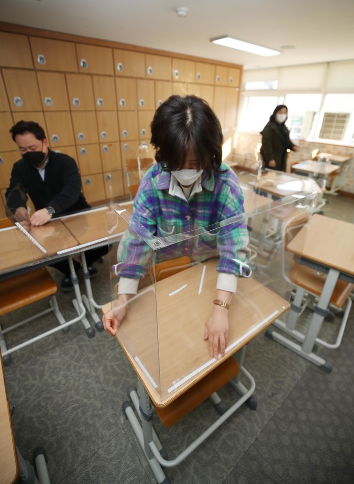 23일 오전 대구 남구 대명동 경북예술고등학교에서 교사들이 개학 후 학생들의 등교에 대비해 코로나19 확산 예방을 위한 투명 가림판을 교실 내 책상에 설치하고 있다.