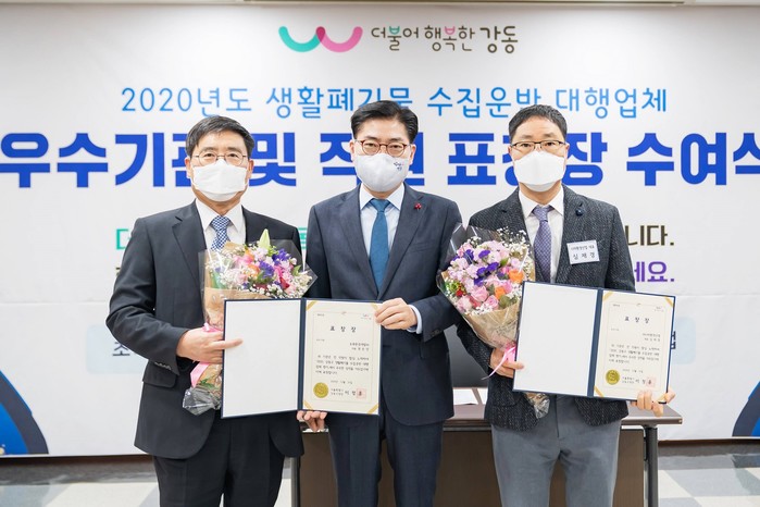 이정훈 서울 강동구청장이 최근 ‘생활폐기물 수집·운반 대행업체 평가’에서 우수한 성적을 거둔 기관에 표창장을 수여했다. 사진은 표창장을 수여한 이 구청장이 수상자들과 함께 기념촬영을 하고 있는 모습. (사진제공=강동구청)