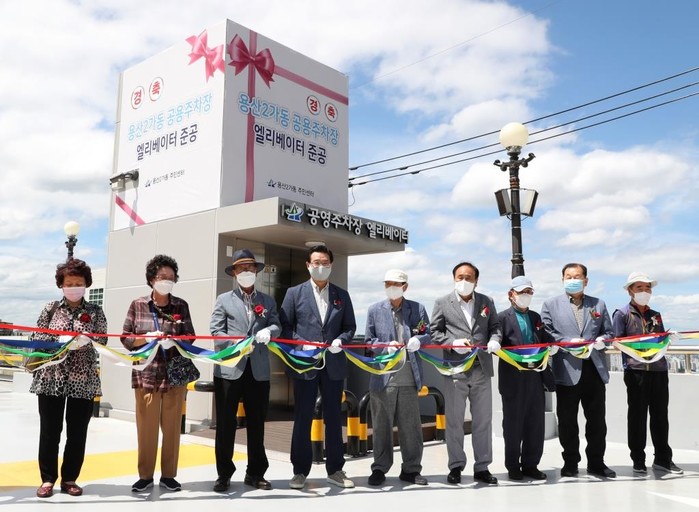 서울 용산구가 지난 16일 용산2가동 공영주차장 이동편의시설 및 주민쉼터 개소식을 열었다. 기존 공영주차장에 엘리베이터(7인승)를 신설해 옥상부까지 연결하고 신흥로~소월로를 잇는 지름길을 만들었으며 옥상에는 주민쉼터를 조성했다. 사진은 개소식에서 성장현 구청장(왼쪽에서 네 번째)이 관계자들과 테이프커팅을 하는 모습. (사진제공=용산구청)