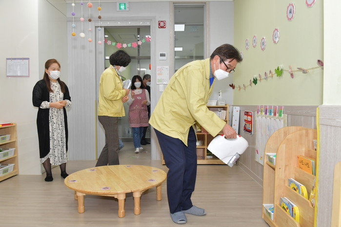 김 시장은 방역관리체계를 점검하면서 감염관리책임자 지정, 외부인 출입제한, 방역물품 비치, 마스크 착용 기준, 확진자 발생시 시설 임시폐쇄 기준 등을 확인했으며, 직접 어린이집 실내 방역소독을 하며 시설내부 곳곳을 점검했다.