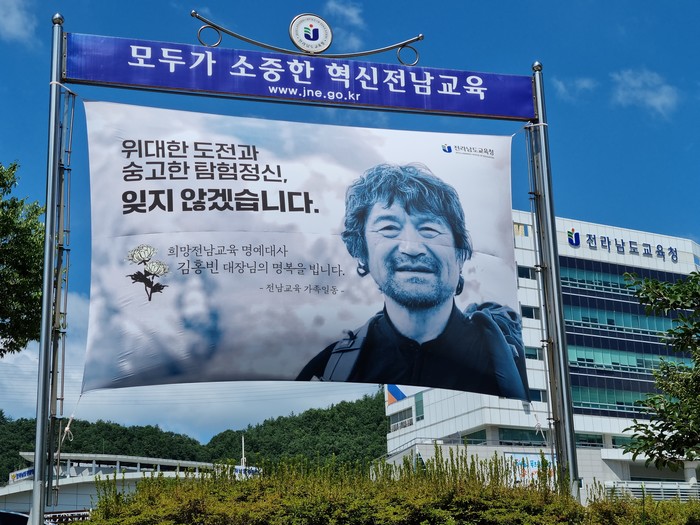 또한, 무안군 삼향읍 어진누리길 청사 입구에도 ‘잊지 않겠습니다. 희망전남교육명예대사 김홍빈 대장의 명복을 빕니다’라는 추모문구와 고 김 대장의 생전 사진을 담은 현수막을 내걸어 전남교육가족의 슬퍼하는 마음을 전했다.