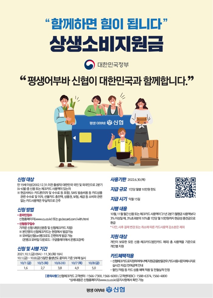 1일부터 조합 창구, 신협홈페이지, 모바일 ON뱅크 앱을 통해 11월 30일까지 신청하면 된다. 신청대상자는 2분기(4~6월) 중 신용 또는 체크카드사용액이 있는 만 19세 이상(2002년 12월 31일 이전 출생자)의 대한민국 국민 및 외국인 개인이며 지원금액은 1인당 월 10만원(총 20만원 한도)이다.
