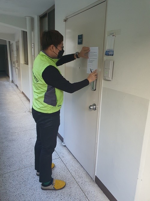 | ▲ 27일 구 직원이 지역내 중장년 이상 1인 가구 실태조사를 위한 안내문을 부착하는 모습. (사진제공=마포구청) |