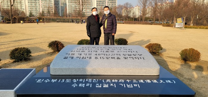 경기 구리시와 13도창의군기념사업추진위원회는 최근 수택동 장자호수공원내 구한말 3대 의병 중 마지막으로 활동한 ‘13도 창의군’을 재조명하고 업적을 후세에 알리기 위한 ‘13도창의군 기념물’을 설치했다. 사진은 기념물 설치 현장을 찾은 안승남 시장(오른쪽)이 관계자와 기념촬영을 하는 모습. (사진제공=구리시청)