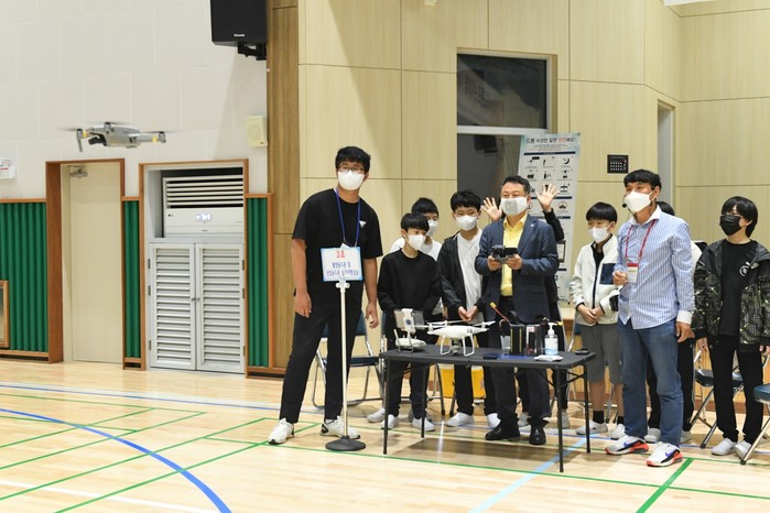 안승남 경기 구리시장이 최근 동인초등학교 6학년 학생들을 대상으로 열린 ‘찾아가는 드론 교육’ 수업을 참관했다. 이날 학생들은 드론 조종법을 배우고, 직접 조립한 교육용 드론 뿐만 아니라 중형 드론·산업용 드론을 조종하는 시간을 보냈다. 사진은 이날 수업을 참관한 안 시장(가운데)이 드론을 조종해보고 있는 모습. (사진제공=구리시청)