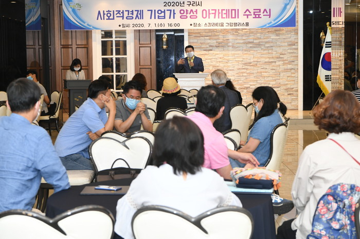 경기 구리시는 1일 ‘2020 구리시 사회적경제 기업가 양성 아카데미’ 수료식을 하고 37명의 수료생을 배출했다. 아카데미는 구리시민을 대상으로 사회적경제 활성화와 사회적경제 조직 발굴을 위한 교육이 이뤄졌다. 사진은 아카데미 수료식에서 안승남 시장이 축사를 하고 있는 모습. (사진제공=구리시청)