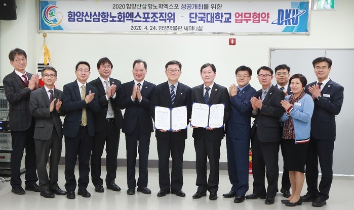 함양산삼항노화엑스포조직위원회(위원장 김경수 경상남도지사)는 지난 24일 함양박물관 세미나실에서 단국대학교(총장 김수복)와 엑스포 성공개최를 위한 업무협약식을 가졌다고 밝혔다.
