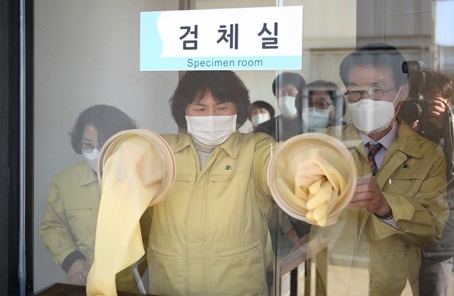 | ▲ 이승옥 강진군수(오른 쪽)가 강진군보건소 내에 설치된 호흡기전담클리닉 검체실을 찾아 설치된 고무장갑을 직접 체험해 보고 있다. / 강진군 제공 |