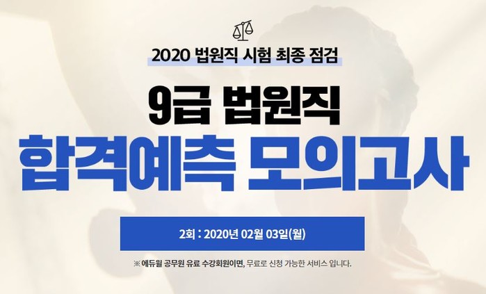 [시민일보 = 여영준 기자]종합교육기업 에듀윌(대표 박명규)은 2020년 법원직 9급공무원 시험을 준비하는 공시생을 대상으로 최종 점검을 위한 ‘합격예측 모의고사’를 진행한다고 22일 밝혔다.