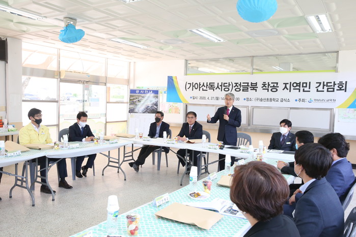 경상남도교육청(교육감 박종훈)은 27일 오후 합천군 가야면 옛 숭산초등학교에서 경남독서학교인 ‘가야산독서당 정글북’을 착공했다. 코로나19로 인해 착공식 대신 지역주민 대표와 시공업체 관계자가 참석한 가운데 지역민 간담회로 대신했다.