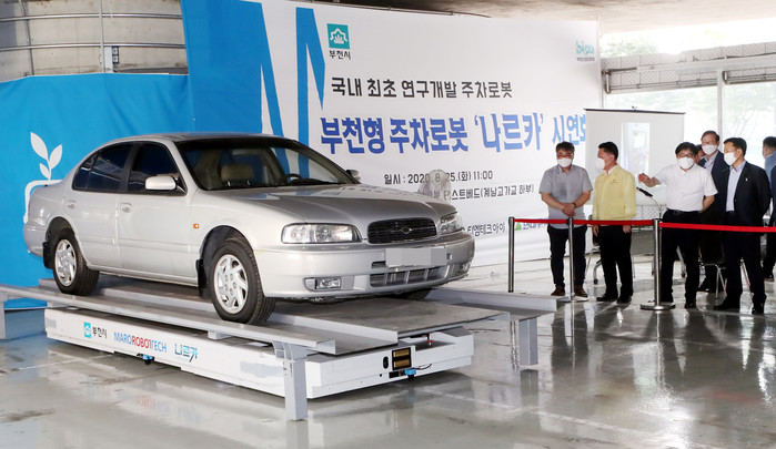 25일 오전 경기 부천시 중동 계남고가차도에 마련된 주차로봇 시험운영장에서 주차로봇 '나르카'가 공개되고 있다. 이 주차로봇은 직육면체 형태로 차량을 들어 올린 뒤 주차면까지 옮기는 방식으로 구동되며 주차장의 효율을 30%가량 상승시키는 효과가 있다고 부천시는 설명했다. 부천시는 오는 10월부터 시범운영을 시작할 계획이다.