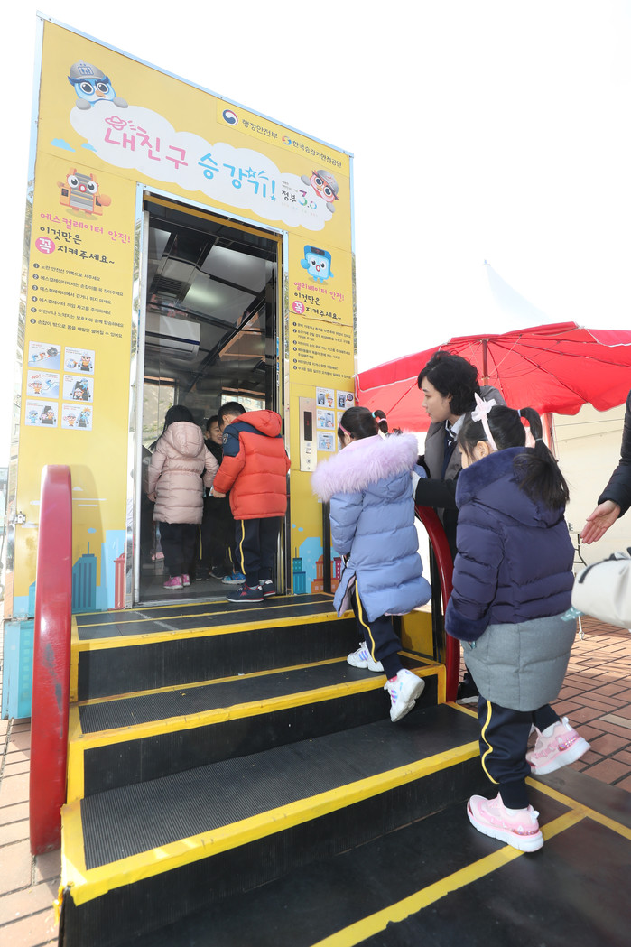21일 오전 서울 서초구 반포종합운동장에서 열린 '찾아가는 어린이 안전체험교실'을 찾은 어린이들이 승강기 안전체험을 하고 있다.