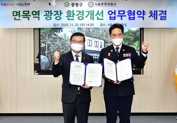 서울 중랑구가 25일 중랑경찰서와 면목역 광장의 노숙인 및 주취자 문제 해결을 위한 협업체계를 구축하기 위해 업무협약을 체결했다. 사진은 협약식에서 류경기 구청장(왼쪽)과 한원횡 중랑경찰서장이 기념촬영을 하는 모습. (사진제공=중랑구청)