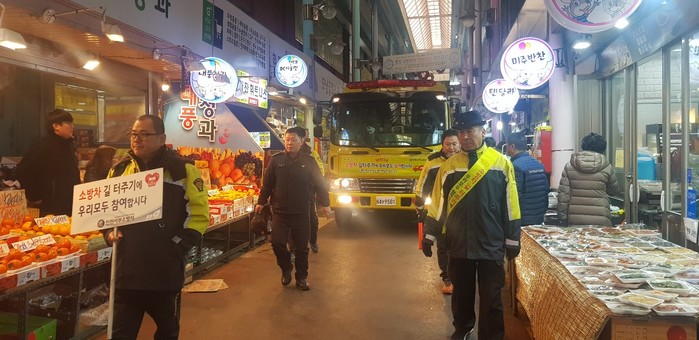 인천 서부소방서는 최근 서구 정서진 중앙시장 등 전통시장 4곳에서 구청, 서부경찰서와 '소방차 길 터주기 훈련 및 캠페인'을 했다. 이날 소방통로 및 소방용수시설 주변 등 불법 주·정차 차량 단속 등도 했다. 사진은 길 터주기 훈련을 하는 모습. (사진제공=서부소방서)
