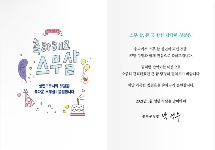 | ▲ 올해 성년의 날에 보내는 ‘축하카드’. (사진제공=송파구청) |