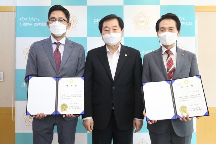 | ▲ 입법·법률 고문 위촉식에 참석한 (왼쪽부터) 김서암 변호사, 길용환 의장, 박광호 교수가 기념촬영을 하고 있다. (사진제공=관악구의회) |