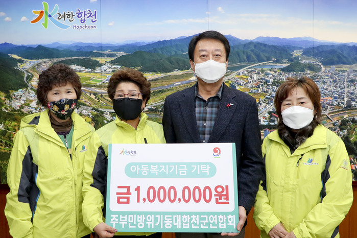 주부민방위기동대 합천군연합회 장외자 회장 등 임원진이 지난 17일 합천군청(군수 문준희)을 방문하여 아동복지기금 100만원을 기탁했다.