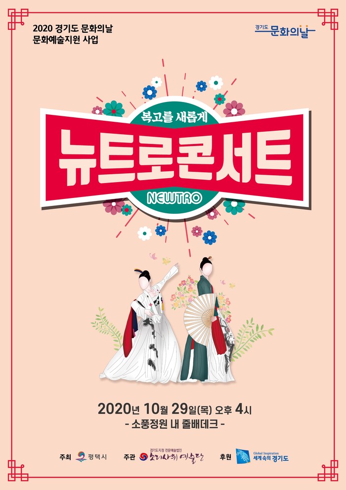 먼저, 29일 목요일 오후 4시부터 소풍정원에서 진행되는 <복고를 새롭게‘뉴트로 콘서트’>는 ‘전통무용과 노래, 음악을 세련되게 현대화’하여 우리의 가・무・악이 주는 풍성하고 완성도 높은 공연을 가을 나들이를 겸해 즐길 수 있도록 준비했다.