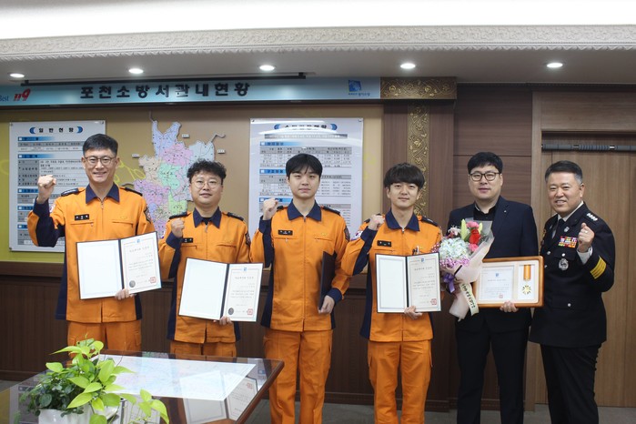 경기 포천소방서는 7일 오전 소중한 생명을 살리는 데 공헌한 구급대원 오동철, 이정은, 황인선, 박선규, 윤신 등 5명과 일반시민 전원택씨에 대해 하트세이버 표창장을 수여했다. 사진은 표창장을 받은 구급대원들과 시민이 기념촬영을 하는 모습. (사진제공=포천소방서)