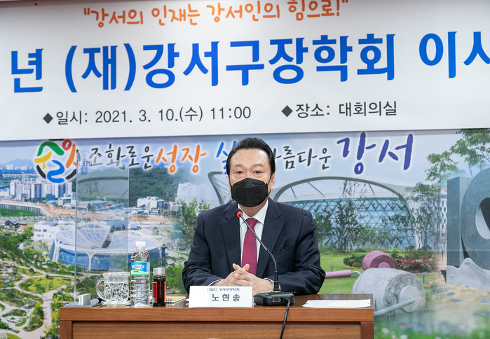 서울 강서구는 지난 10일 (재)강서구장학회 이사회를 개최하고 2020년 사업실적 결산 승인, 2021년도 장학기금 운영 보고 등에 대해 논의했다. 사진은 (재)강서구장학회 이사회에 참석한 노현송 구청장이 발언을 하고 있는 모습. (사진제공=강서구청)