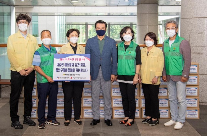 새마을운동 용산구지회가 지난 31일 용산구 보건소에 ‘홍삼 세트’ 71박스(1800만원 상당)를 전달했다. 이날 전달식은 구청사 1층에서 열렸으며 성장현 용산구청장, 지영환 새마을운동 용산구지회장, 최재원 보건소장 등이 참석했다. 사진은 성 구청장(가운데) 및 참여자들이 기념촬영을 하는 모습. (사진제공=용산구청)
