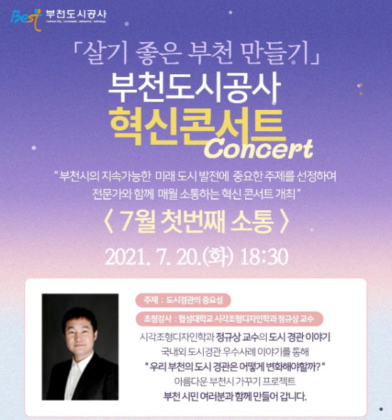 콘서트는 7월부터 12월까지 매월 1회 개최할 예정이다. 콘서트 첫 번째 소통 주제는 ‘도시경관의 중요성’으로 공공디자인 분야 전문가인 정규상 교수를 초빙, 진행한다.