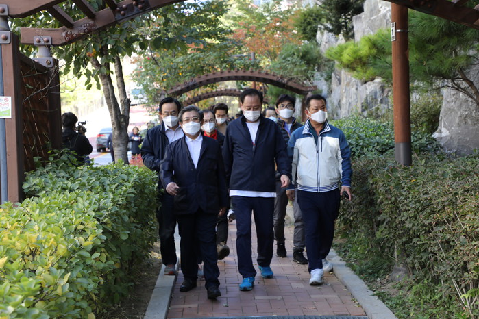| ▲ 조영덕 의장(앞줄 왼쪽)이 유동균 구청장(앞줄 가운데) 및 구의회 의원들과 아현동 고갯길을 걷고 있는 모습. (사진제공=마포구의회) |