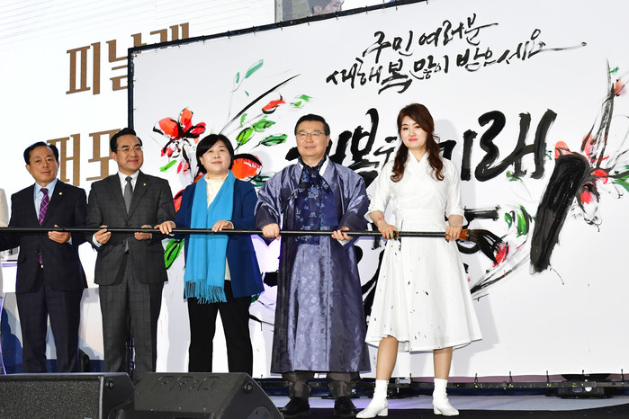 서울 중랑구는 지난 6일 중랑문화체육관에서 국회의원과 시·구의원, 유관기관장, 직능단체장, 주민 등 2000여명이 참석한 가운데 구민과 함께 2020년 희망의 새해를 여는 ‘2020년 신년인사회’를 개최했다. 사진은 류경기 구청장(오른쪽에서 두 번째)이 ‘2020년 신년인사회’ 마지막 행사인 캘리그라피 퍼포먼스를 함께하고 있는 모습. (사진제공=중랑구청)