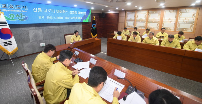 경기 오산시가 28일 중국 우한 폐렴(신종 코로나바이러스 감염증) 확산 방지를 위한 ‘신종 코로나바이러스 감염증 확산 방지 대응 추진 상황 보고회’를 개최하고 분야별 대응방안과 연휴기간 중 추진 상황에 대해 논의했다. 사진은 회의 진행 모습. (사진제공=오산시청)