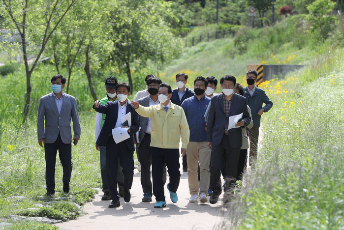 정순균 강남구청장이 20일 세곡천 일대의 경관 및 주민들의 이용환경 개선을 위해 진행되는 은곡교~세곡3교에 이르는 ‘더 좋은 세곡천 만들기’ 공사 현장을 방문했다. 사진은 관계자들과 함께 세곡천 현장을 둘러보고 있는정 구청장(가운데)의 모습. (사진제공=강남구청)