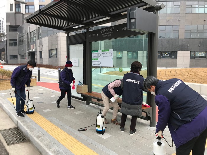 코로나19로 인해 사회적 거리두기가 시행됨에 따라 서울 강동구 17개동 총 563명의 복지통장들이 마스크 전달, 공공시설 방역활동, 취약계층 돌봄 등 지역주민들을 위한 다양한 활동들을 펼치고 있다. 사진은 버스정류장 방역활동을 하고 있는 복지통장들의 모습. (사진제공=강동구청)