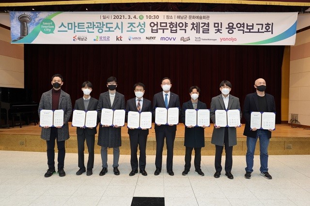 해남군은 4일 군 문화예술회관 다목적실에서 2021년 스마트관광도시 조성 용역보고회를 갖고, 강진군 및 컨소시엄 업체와 업무협약을 체결했다.