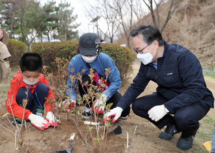 서울 금천구가 제76회 식목일을 맞아 지난 27일 삼성산2터널 상부공원에서 구민과 함께하는 나무심기 행사를 개최했다. 사진은 행사에 참여한 유성훈 구청장(오른쪽)이 주민들과 함께 나무를 심고 있는 모습. (사진제공=금천구청)
