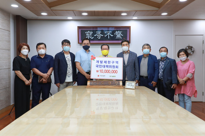 경기 남양주시는 지난 20일 개발제한구역 국민대책위원회로부터 코로나19 극복 지원을 위한 성금(1000만원)을 경기사회복지공동모금회를 통해 전달받았다. 사진은 전달식에서 조광한 시장(가운데)이 관계자들과 기념촬영을 하고 있는 모습. (사진제공=남양주시청)