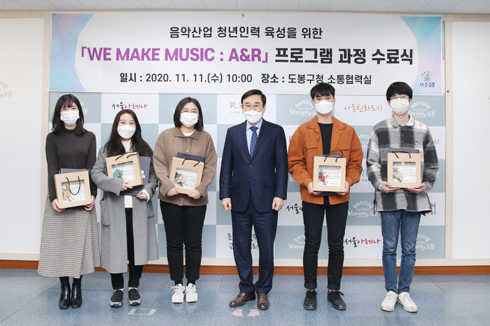 도봉구는 지난 11일 ‘WE MAKE MUSIC : A&R’ 프로그램 수료식을 개최했다. 국내 대표 엔터테인먼트 현직 A&R이 주축이 돼 ▲A&R 특강 ▲앨범 기획안 작성 및 멘토링 등 100여일 동안의 교육과정을 끝마쳤다. 사진은 수료식에서 이동진 구청장(오른쪽에서 세 번째)이 교육 참여자들과 기념촬영을 하는 모습. (사진제공=도봉구청)