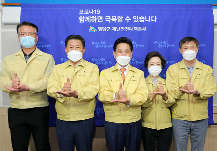전동평 전남 영암군수는 13일 코로나19 극복을 위해 불철주야 노력 중인 의료진과 관계자들을 응원하기 위한 ‘덕분에 챌린지’ 캠페인에 동참했다. 사진은 전 군수(가운데)와 직원들이 엄지손가락을 치켜든 수어 동작을 하며 의료진에 감사 메시지를 전하는 모습. (사진제공=영암군청)
